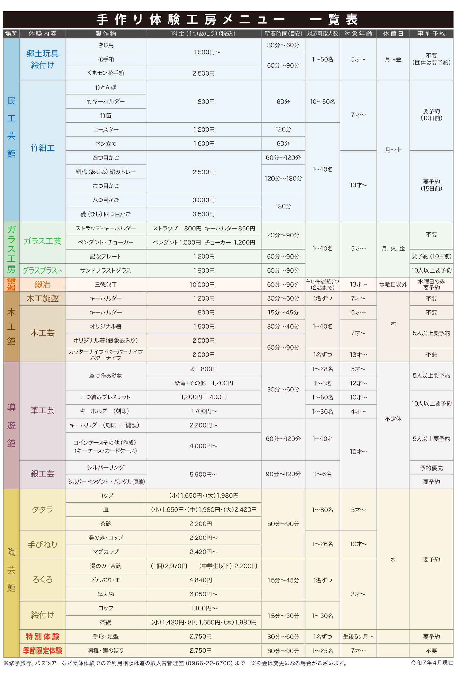 手作り体験工房メニュー一覧表(料金)